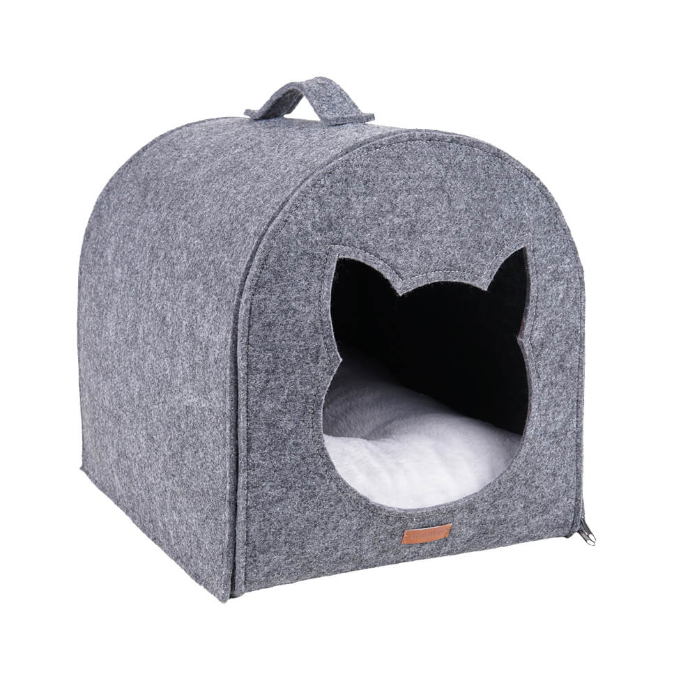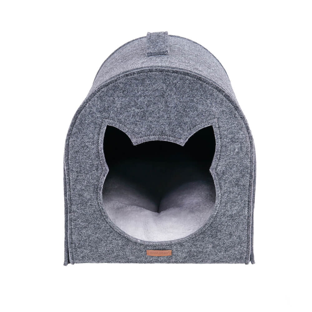 Hygge Cat House er en kattehule som enkelt kan brettes sammen og lagres uten at den tar mye plass. Inngangen til kattehulen er en utskjæring i form av et kattehode.